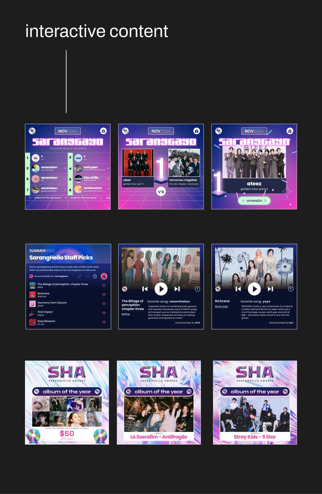 Innovated engagement driving interactive content series posts like K-pop-inspired top charts and year-end awards that reflect community culture while driving interaction and brand affinity.